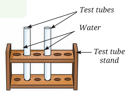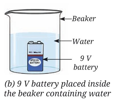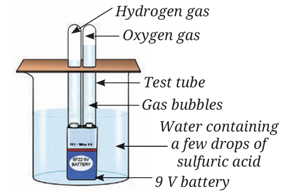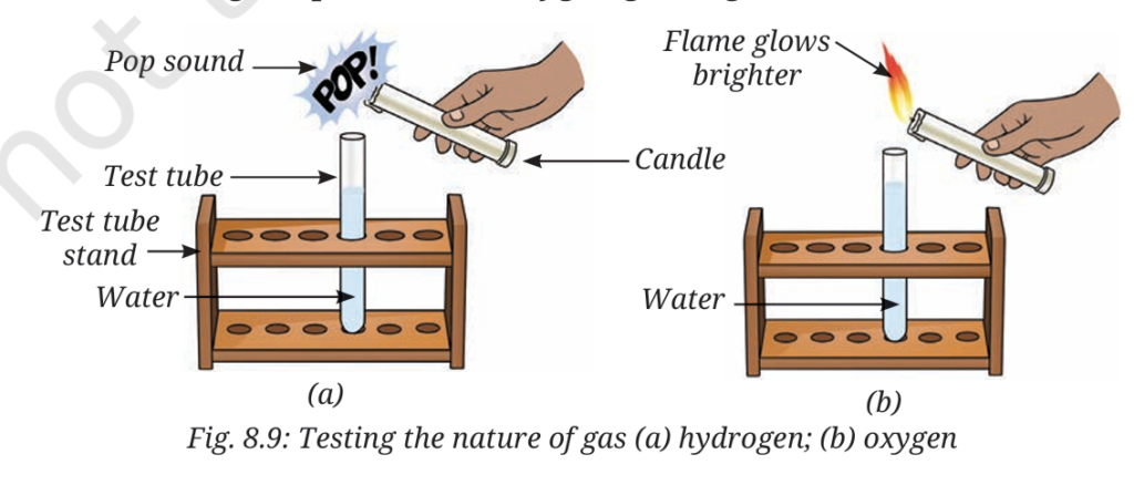 A chemistry teacher sets up a demonstration (Refer Activity 8.3) to investigate the nature of water. A beaker is filled with water containing a few drops of dilute sulfuric acid. Two water-filled test tubes are inverted over the terminals of a 9 V battery placed inside the beaker. After allowing the process to continue for 15 minutes, gas bubbles are observed collecting inside both inverted test tubes. The gas volume in one tube is noticeably double that of the other. The gas with the larger volume is removed and tested with a burning candle, resulting in a distinct “pop” sound.